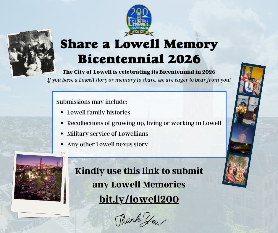 As we gear up to celebrate the City of Lowell’s Bicentennial in 2026, we’re inviting you to share your memories with us! Whether it’s a family story, a moment from growing up in the city, your time working or serving in the community, or any Lowell connection that’s meaningful to you—we want to hear it!Select stories will be featured on the new Lowell Bicentennial website as part of this once-in-a-lifetime celebration.