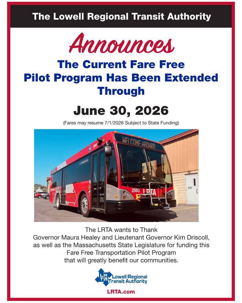 The Fare Free Transit Pilot Program has been extended through June 30, 2026 on the Lowell Regional Transit Authority (LRTA)! This means more accessibility, more savings, and more opportunities for our community to get where they need to go.Public transportation should be affordable and accessible for everyone—and this program is a big step forward.